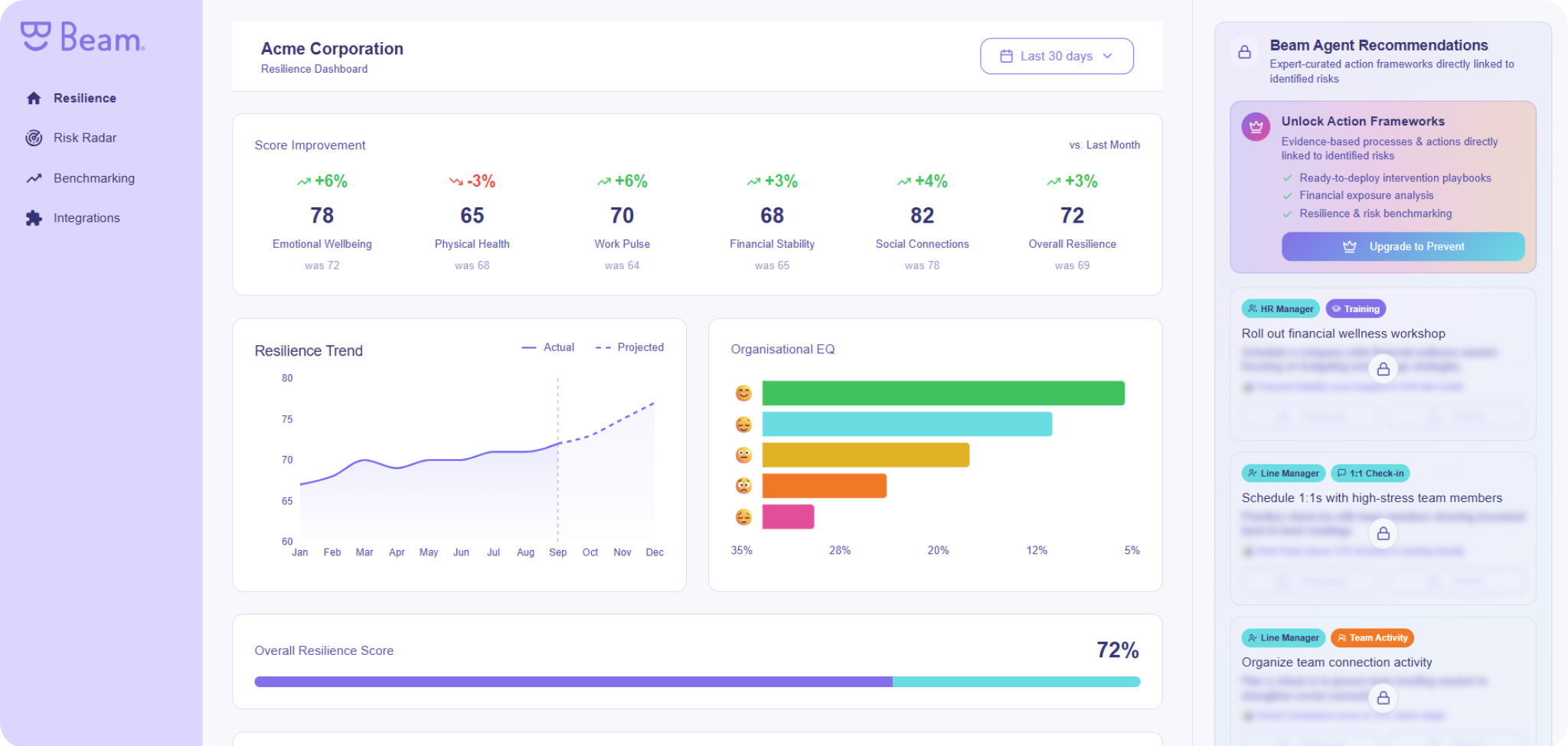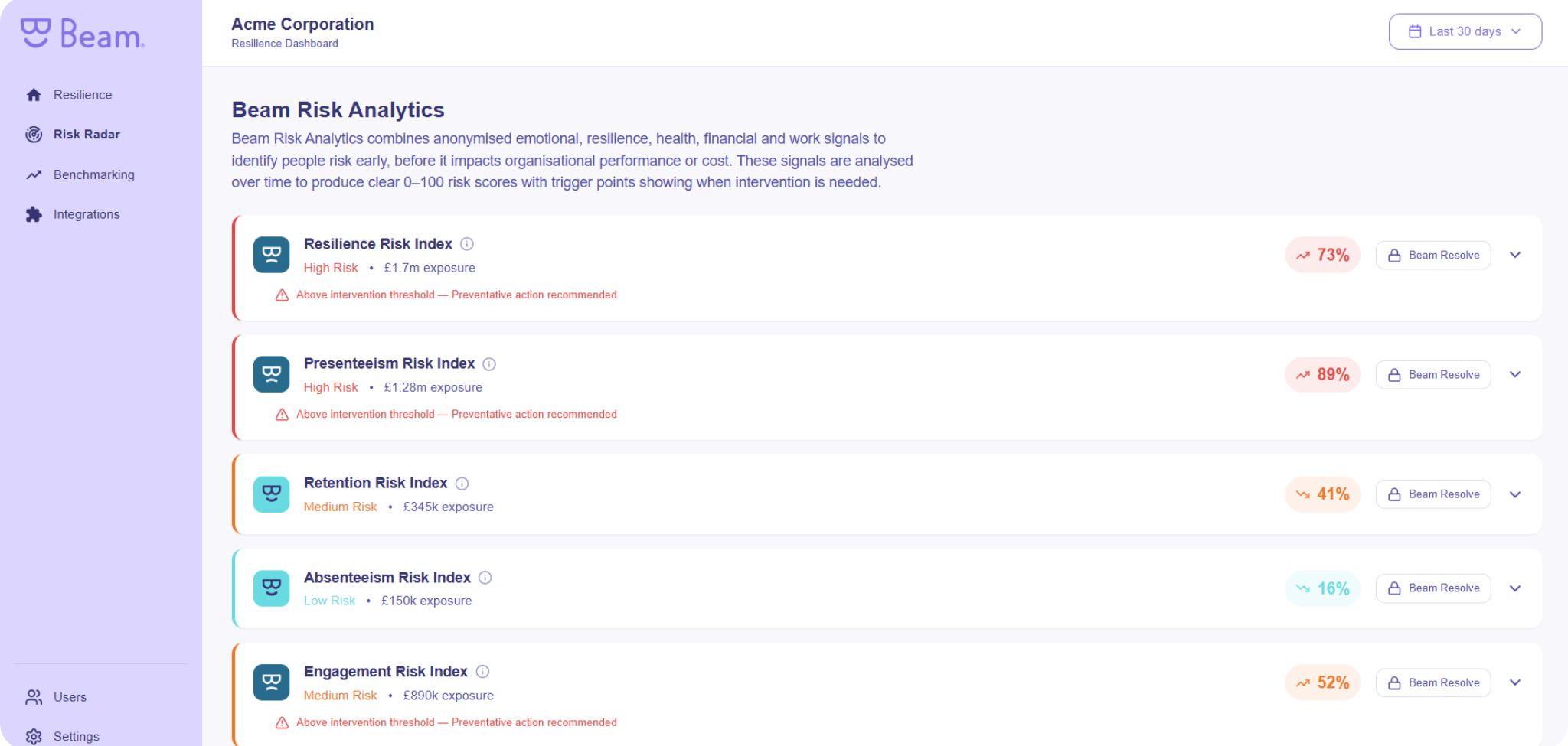 Beam’s AI-powered Resilience Intelligence System uncovers and predicts hidden stress patterns, measures risk and impact, and delivers the right support so people and organisations can act early.