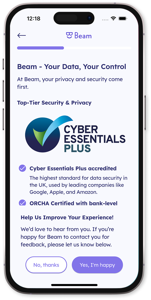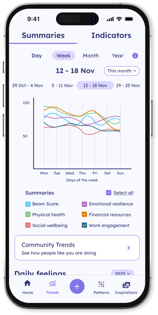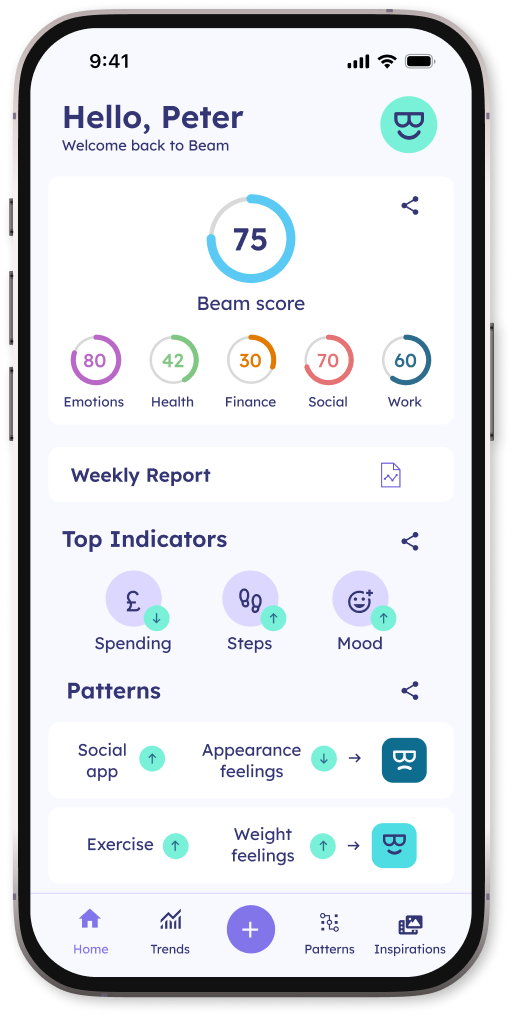 Everyday life is a series of ups and downs. Beam is a constant companion providing a holistic analysis of your resilience and well-being, considering physical and mental health, finances, relationships, and more. Its personalised, private approach is engaging, providing perspective and motivation to users to transform everyday life.