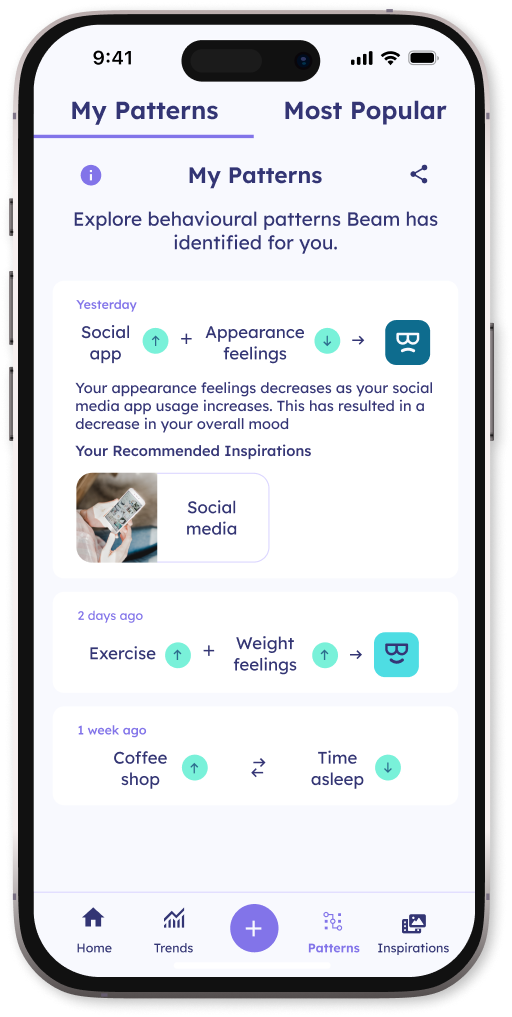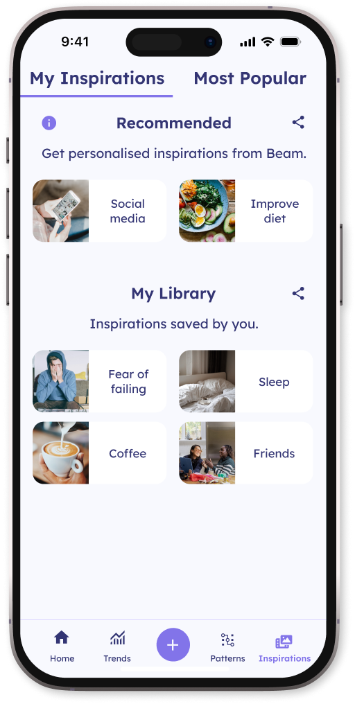 Beam provides you with comprehensive real-time information and insights about your resilience and well-being. These actionable insights are identified through proprietary Machine Learning algorithms and A.I. which pinpoint and predict your triggers & patterns, empowering you to identify and address the root causes of your stress.